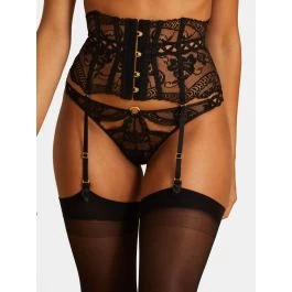 Der Taillengürtel besteht vorne, sowie an den Seiten aus sehr feiner Leavers Spitze und ist daher leicht transparent. Durch den oberen Teil des Gürtel zieht sich eine präzise Guipure Borte. Der Strapsgürtel erinnert durch die stützenden Stäbchen vorne und hinten, dem Korsettverschluss und dem geschnürten Rücken an ein Korsett. Das Highlight dieser Reizwäsche ist die aufwändige Rückseite, welche durch Schnürungs-Bänder mit goldenen Ringen besonders heraussticht. Sowohl die feine Guipure Borte, als auch der spektakuläre Rücken, enthüllen die Haut auf sinnliche Weise und verleihen dem Strapsgürtel eine erotische, unwiderstehliche Note.