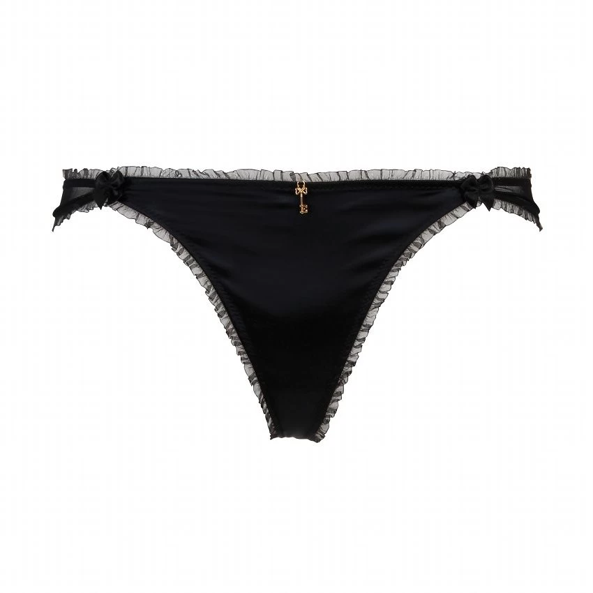 Dieser String besteht auf der Vorderseite aus schwarzem Stretch-Satin und auf der Rückseite aus schwarzem Tüll. Die Abschlüsse sind verspielt mit einem welligen Tüllband benäht. Die Vorderseite zieren zwei kleine, schwarze Schleifchen und der „Escora-Schlüssel“. Der String ist in den Größen 38-42 erhältlich.