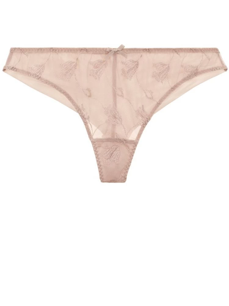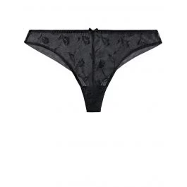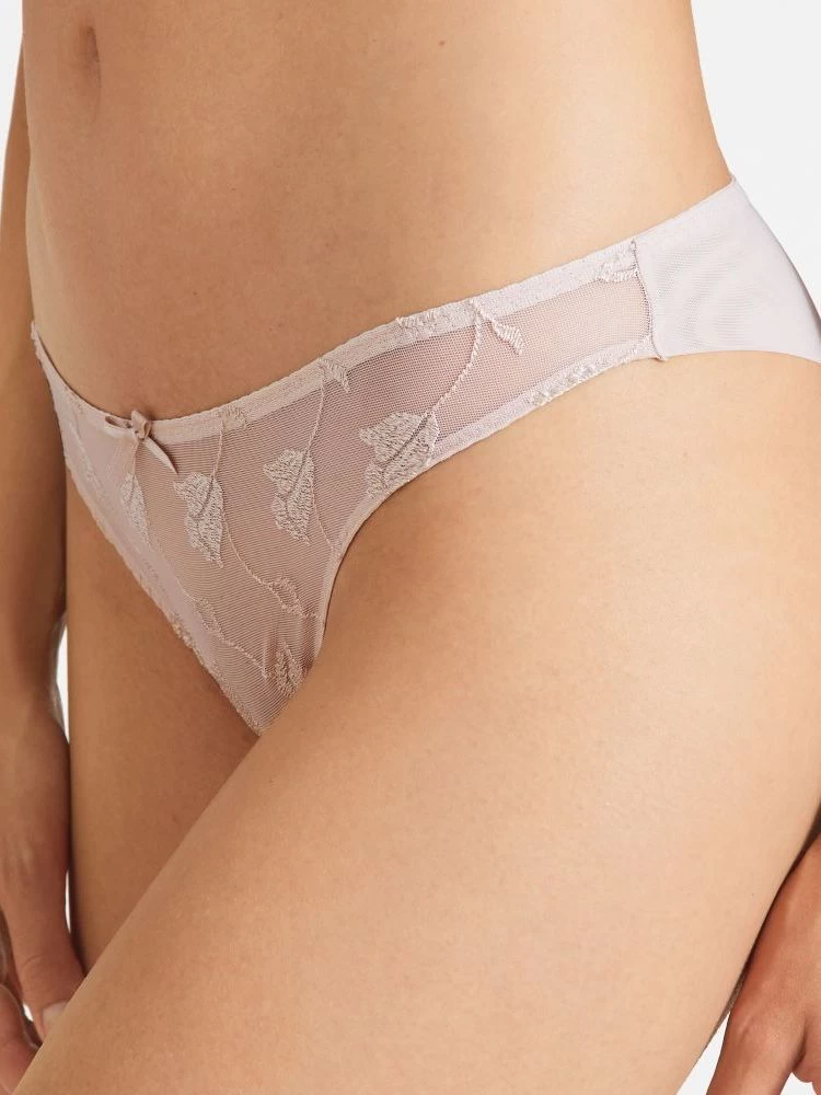 Der Brazilian String ist aus Tüll und bestickter Tüllspitze gefertigt. Der Tüll ist hinten in Futteralverarbeitung verwendet für besonders flache Kanten. Der String ist semitransparent und hat einen Innenzwickel aus Baumwolljersey.