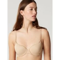 Der BH hat dünn wattierte gemoldete Schalen-Cups mit Bügel, welche eine glatte Oberfläche haben. Die Cups haben leichte, nahtlos ausgeformte und anschmiegsame Einlagen und sind mit einem edel glänzenden, gleichfarbigen Satinband eingefasst. Dieser BH ist besonders leicht, trägt nicht auf – und kaschiert dennoch die Brustwarzen. Damit ist er z.B. auch für den Sommer oder als T-Shirt BH geeignet…