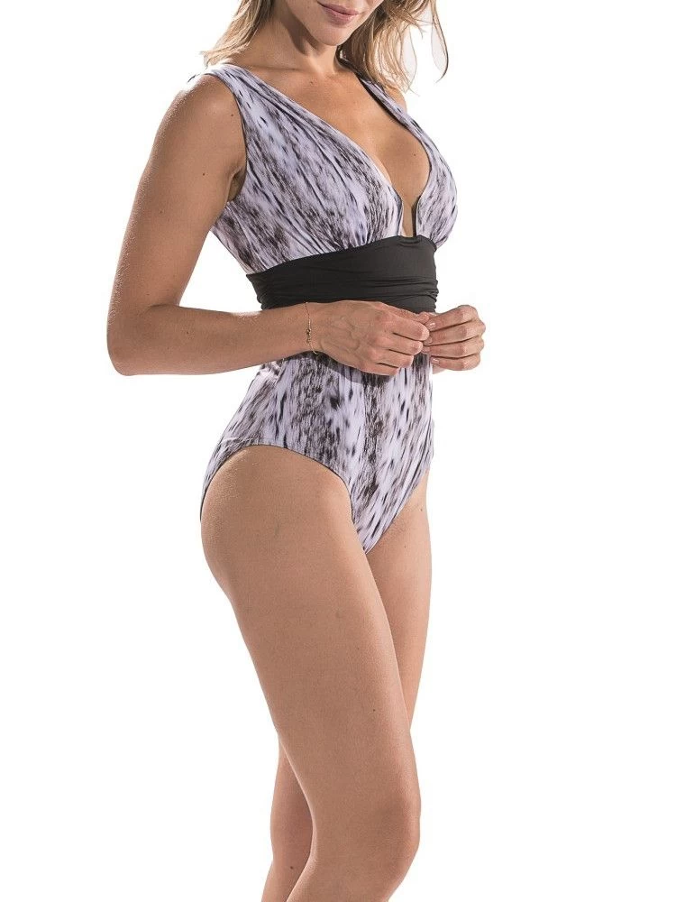 Der Träger-Badeanzug Molto von Nicole Olivier besteht aus feinem Microfaser Gewebe und ist mit einem angedeuteten Animal Muster in grau und weiß bedruckt. Der Animal Print Badeanzug mit Trägern ist doppellagig gearbeitet und unterhalb der Büste mit einer in weichen Falten fallenden, schwarzen Schärpe verziert. Es sind keine Cupgrößen ausgewiesen – der Badeanzug passt am Besten für B- bis C-Cup.
