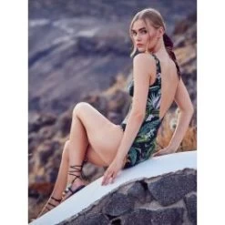 Dieser zeitlose Badenanzug von Fürstenberg überzeugt durch seinen modischen Druck und die feine Farbstellung in schwarz mit grün.