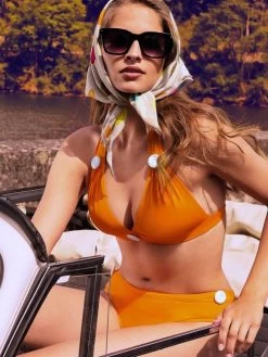 Die dünnen Bindebändchen vom Oberteil enden in metallischen Schmuckperlen mit Eniqua Gravur und auch im Decolleté mittig befindet sich ein Schmuckteil aus Metall. Dieser Bikini ist bei uns in den Größen S bis XL erhältlich.