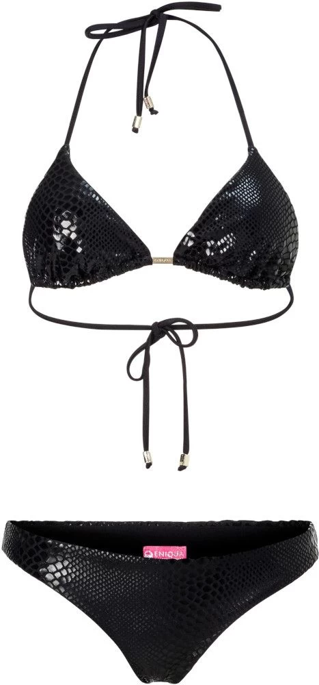 Der Triangel Bikini Black Mamba ist luxuriöse Bademode von Eniqua. Die Bademode der schweizer Beachwear Marke Eniqua verführt mit besonders modischen Entwürfen und hochwertigen Materialien. Dieser hochwertige Bikini hat einen schwarz glänzenden Schlangen-Optik Druck auf einem weichen, schnell trocknenden Microfaserjersey und ist kombiniert mit goldenen Schmuckelementen aus Metall.