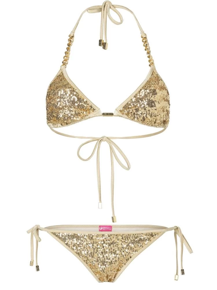Der Triangel Bikini Golden Monster Bling ist luxuriöse Bademode von Eniqua. Die Bademode der schweizer Beachwear Marke Eniqua verführt mit besonders modischen Entwürfen und hochwertigen Materialien. Dieser hochwertige Bikini ist allover mit gold glänzenden Pailletten bestickt. Der Bikini aus einem weichen, schnell trocknendem Microfaserjersey ist kombiniert mit glänzenden, goldenen Schmuckelementen aus Metall.