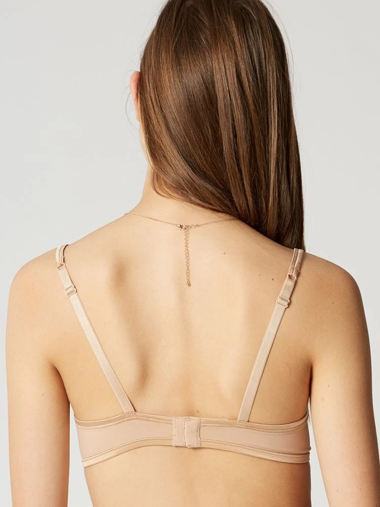 Seitlich und hinten besteht der BH aus Microfaser-Jersey und auf der Rückseite wird er mit einem doppelten Häkchenverschluss (vierfach verstellbar) geschlossen. Die Träger aus glänzendem Satin sind elastisch und in der Länge verstellbar. Der BH ist blickdicht.