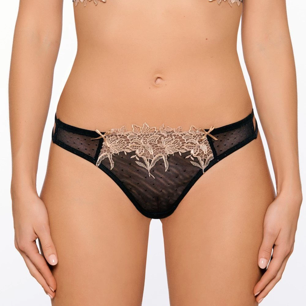 Der Tüll-String Desir ist eine luxuriöse Lingerie aus Spitze und Pünktchen-Tüll der französischen Edel-Dessous Marke Millesia. Der String ist aus gepunktetem Tüll gefertigt, welcher mit exquisiter Guipure Blütenspitze benäht ist.