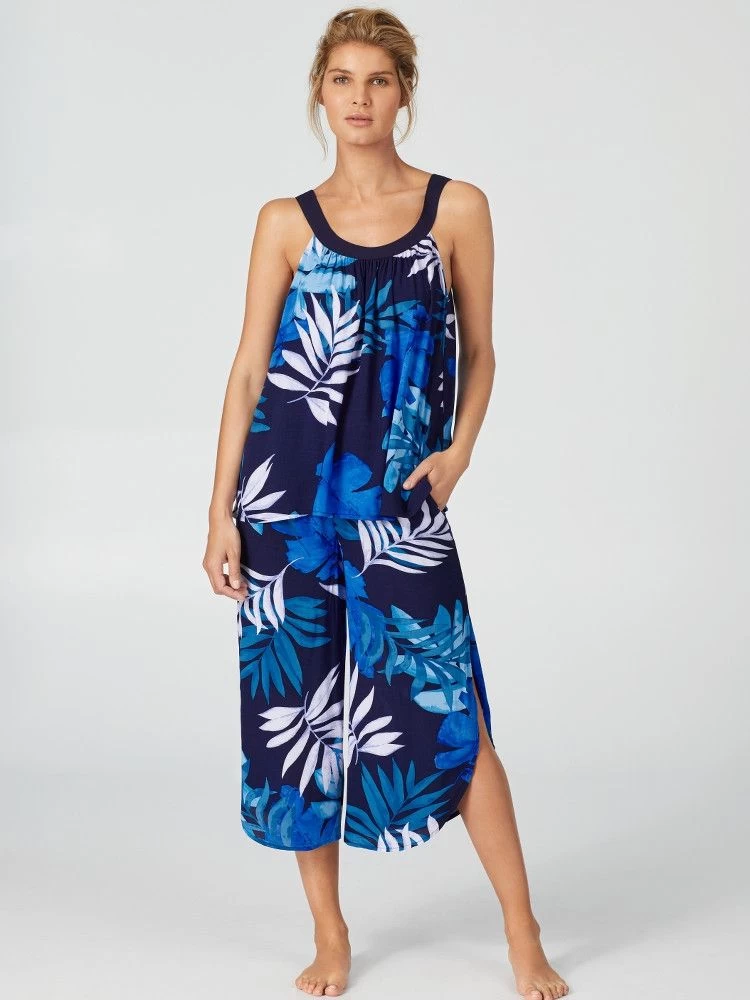 Dieser sommerliche Pyjama hat einen ausgefallenen Druck mit Palmblättern in mehreren Blautönen auf tinten-blauem Grund. Er ist perfekt für die warme Jahreszeit geeignet, ungefüttert und kann daher als Sommer Pyjama, Strandanzug oder auch als gemütliche Homewear getragen werden.