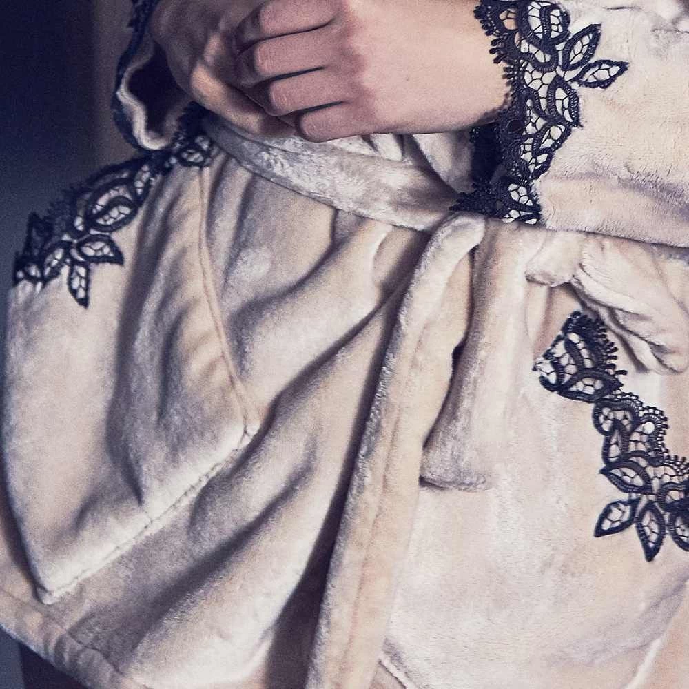 Der lange Morgenmantel Freda der französischen Luxus-Marke Marjolaine ist aus flauschig-weichem Teddy-Plüsch (100% Polyester) mit üppigem Spitzenbesatz am Revers und den Ärmeln gefertigt.